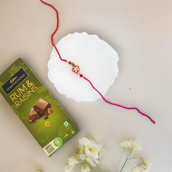 Embrace the bonds of love and tradition with our exquisite maroon floral rakhi, a mesmerizing blend of artistry and affection. This unique rakhi features an intricate design showcasing delicate floral motifs in rich maroon hues, symbolizing the warmth and elegance of sibling relationships. Adorned with shimmering beads and lustrous threads, this rakhi evokes a sense of nostalgia and heartfelt connection. Accompanying this striking rakhi is a delightful Cadbury Temptations chocolate bar, a perfect treat to indulge your sibling’s sweet tooth. With its velvety smooth texture and rich flavors, it complements the essence of the rakhi, making it an ideal gift for this special occasion. As you tie this beautiful rakhi onto your brother''s wrist, you not only celebrate the cherished bond you share but also create priceless memories filled with love, laughter, and sweetness. Share the joy of Raksha Bandhan with this exceptional fusion of tradition and taste!
