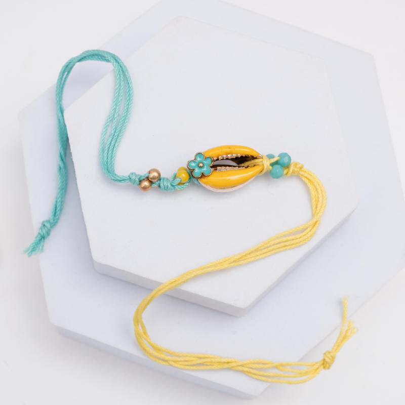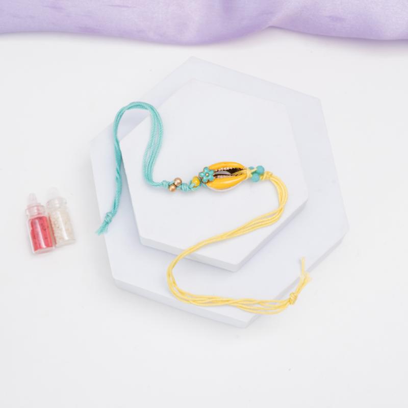 Embrace the spirit of warmth and positivity with the Sunshine Spirit Yellow Shell Rakhi. Adorned with a delicate shell centerpiece and bright yellow threads, this rakhi radiates joy, energy, and love. Perfect for brothers who appreciate simple yet meaningful designs, this rakhi brings beachy charm and festive vibes together in one thoughtful token.