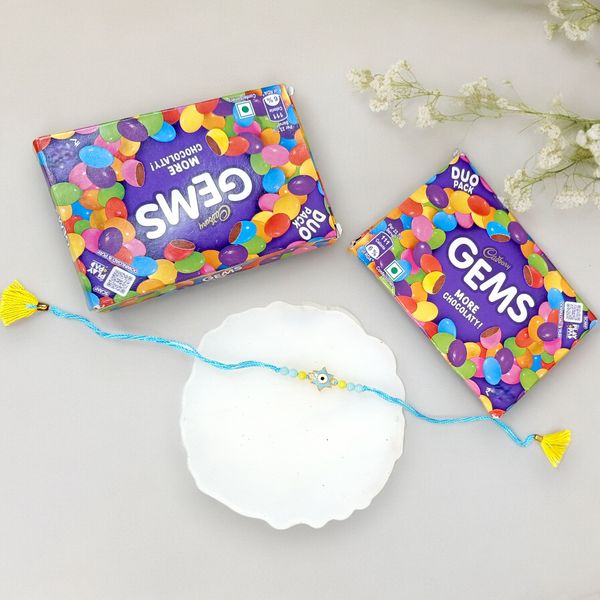 Embrace the protective charm of tradition with our exquisite Evil Eye Rakhi, designed to not only celebrate the bond of sibling love but also to shield your loved ones from negativity. This enchanting piece features a striking evil eye motif, symbolizing warding off malevolent energies, intricately adorned with dazzling gems that catch the light and the eye alike. The set comes beautifully packaged in a luxurious double-gem box, adding an elegant touch to your gifting experience. The thoughtfully curated gems, each selected for their unique vibrational properties, complement the rakhi''s spiritual essence. Whether draped on your brother''s wrist during the festive occasion or gifted as a token of care, this rakhi embodies love, protection, and style. In every glance of the beads and every shimmer of the gems, let your sibling feel cherished and safeguarded, making this more than just a rakhi, but a heartfelt promise of unwavering support.