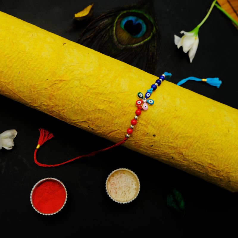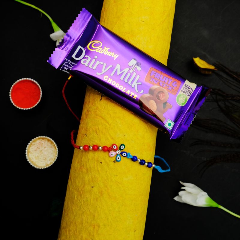 Embrace the charm of the Mystical Gaze Rakhi with Dairy Milk, a vibrant symbol of protection adorned with the traditional evil eye motif. This colourful rakhi is paired with delicious Dairy Milk chocolates, making it a delightful gift for your beloved brother.