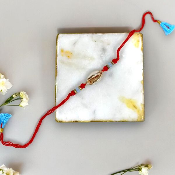 Experience the ocean''s charm with our exquisite shell rakhi, a delightful adornment that beautifully fuses tradition with nature''s artistry. Crafted from authentic shells, this rakhi embodies a serene coastal essence, inspiring feelings of tranquility and connection. Each shell is meticulously selected and hand-designed, showcasing a unique pattern that tells the story of the sea. Vibrant threads accentuate the natural hues of the shell, symbolizing the unbreakable bond of love and protection between siblings. This rakhi not only serves as a timeless accessory but also as a token of cherished memories, evoking the spirit of joyous celebrations. Perfect for siblings who share a love for the ocean or nature, the shell rakhi is an eco-friendly choice, promoting sustainability while embracing cultural significance. Embrace the waves of affection and let this unique rakhi become a cherished part of your sibling bond, making this Raksha Bandhan truly unforgettable.
