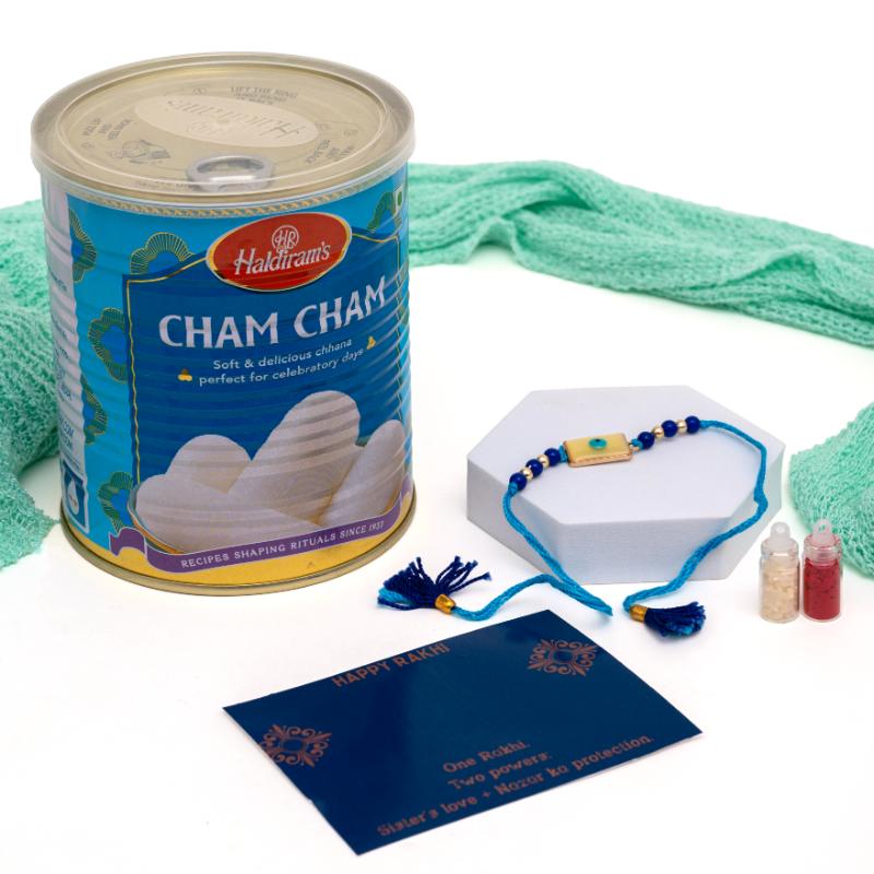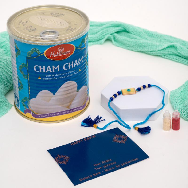 Ward off negativity and bless your brother with our unique Oceanic Eye Protection Rakhi. This distinctive piece features the potent Evil Eye charm, elegantly set amidst a serene blue thread and shimmering blue beads, symbolizing vigilance, peace, and good fortune. It''s more than just a rakhi; it''s a powerful talisman designed to safeguard your brother from ill-will and bring him tranquility, reflecting your deep care and unwavering support. This meaningful token of your bond comes perfectly paired with a generous 1kg of juicy, spongy Cham Cham, adding a burst of delightful sweetness to his Raksha Bandhan celebration.