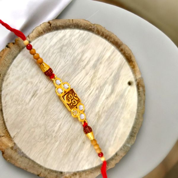 Om Rakhi is a beautifully crafted symbol of devotion and spirituality, intricately designed to encapsulate the essence of love and protection shared between siblings. The ''Om'' symbol, a sacred representation of the universe in Hinduism, signifies the cosmic essence and is believed to bring peace, positive energy, and divine blessings. This exquisite rakhi serves not only as a token of affection but also as a spiritual talisman that fosters harmony and strengthens the bond of brother and sister. Handcrafted with high-quality materials, it often features vibrant threads and adorned with embellishments that reflect traditional artistry. Each Om Rakhi is a unique piece, conveying heartfelt sentiments of love, safety, and commitment. As siblings tie this rakhi around each other''s wrists, they celebrate their unbreakable bond, promising to cherish and protect one another through life''s journey, making it a perfect embodiment of tradition, love, and spirituality.