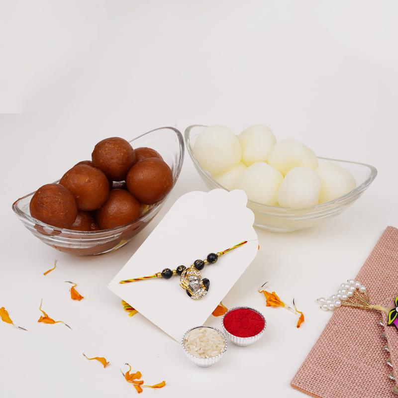 Celebrate the essence of Raksha Bandhan with divine blessings and unmatched sweetness through our Om Krishna Rakhi with Gulab Jamun & Rasgulla 1kg Each. This intricately designed rakhi features the sacred Om symbol alongside the image of Lord Krishna, symbolizing love, protection, and spirituality. Paired with 1kg each of soft Gulab Jamun and spongy Rasgulla, this combo is perfect for brothers with a sweet tooth. Whether celebrating in India or sending to the Australia, this set makes a lasting impression.