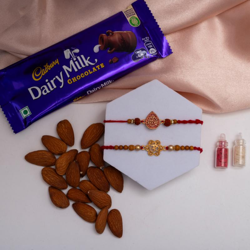 A thoughtful blend of tradition and treats, this Om & Hari Om Rakhi Set includes two spiritually rich rakhis, a Dairy Milk chocolate bar, and 100gms of premium almonds. With one rakhi featuring the divine "Om" and the other "Hari Om," this combo offers your brother blessings of protection, peace, and sweetness. Ideal for those who cherish spiritual meaning and festive indulgence in one beautiful gift.