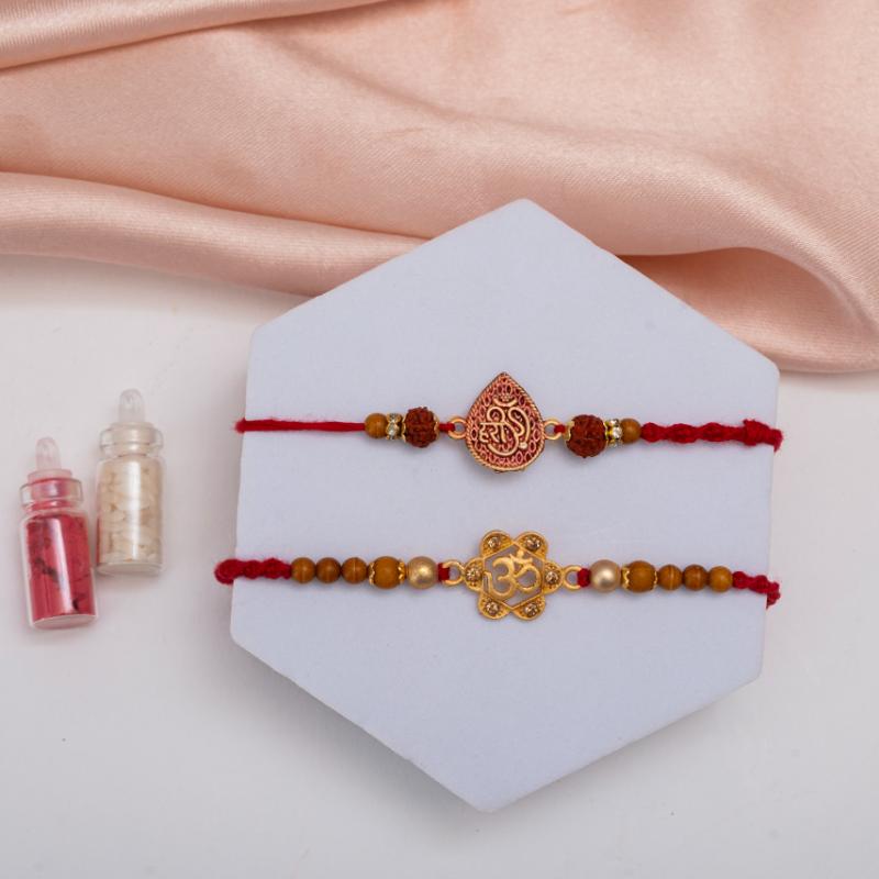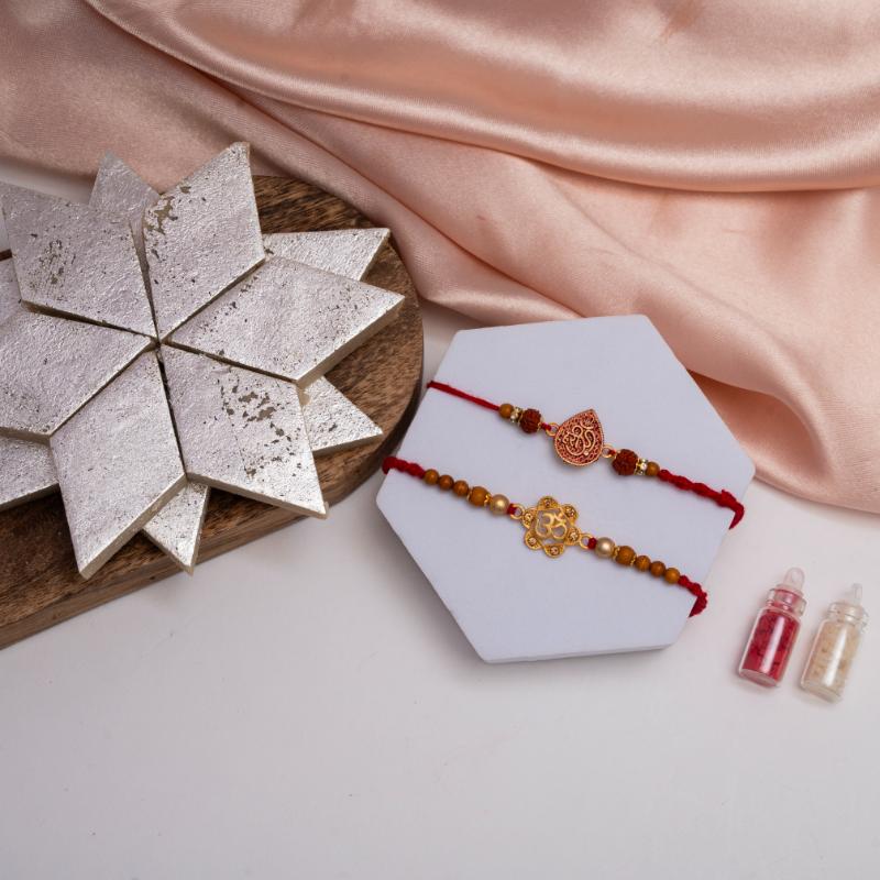 Celebrate Raksha Bandhan with a harmonious blend of spirituality and sweetness for your beloved brothers! This unique set includes: Auspicious Om Rakhi: Adorn your brother''s wrist with this revered rakhi featuring the sacred ''Om'' symbol. It represents universal peace, creation, and completeness, bringing auspiciousness and positive energy into his life. Divine Hari Om Rakhi: The second rakhi in this set showcases the sacred ''Hari Om'' mantra, symbolizing divine blessings, spiritual well-being, and protection. It''s a profound token of your love and good wishes. This spiritual duo comes thoughtfully paired with 200gms of rich, melt-in-your-mouth Kaju Katli, a beloved traditional sweet that adds a delightful touch to your heartfelt Raksha Bandhan celebrations.