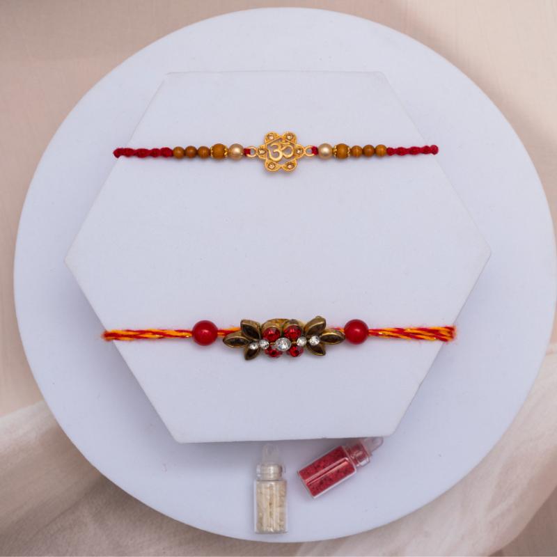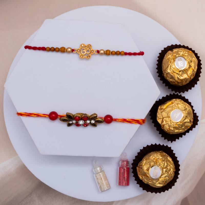 Celebrate the sacred bond of Raksha Bandhan with this elegant Om & Stone Rakhi Set, paired with 3pcs of Ferrero Rocher chocolates. Featuring one rakhi with the divine "Om" symbol and another with a sleek stone centerpiece, this combo blends tradition with refined taste. The rich, nutty indulgence of Ferrero Rocher adds a sweet finish to your heartfelt gesture—perfect for brothers who value both blessings and treats.
