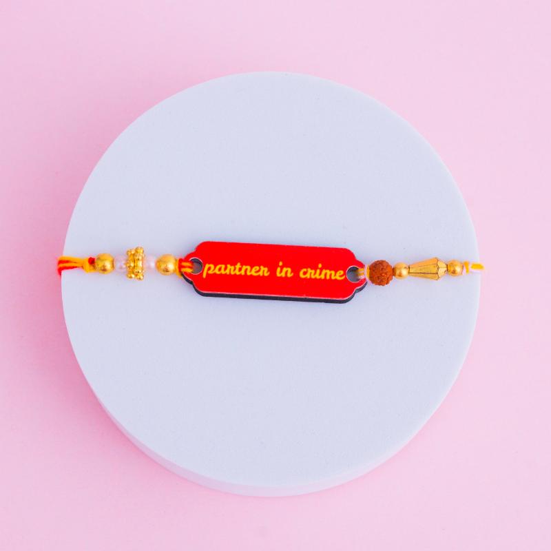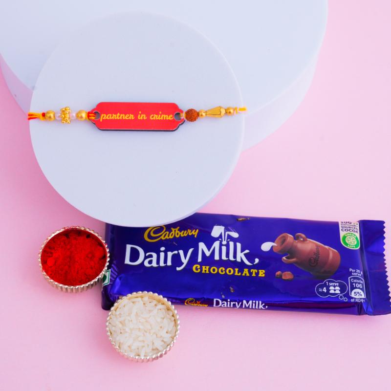For the sibling who’s been your secret keeper, prank planner, and forever teammate—this Partner in Crime Rakhi says it all! Paired with a 100g Dairy Milk bar, this combo celebrates the mischief and memories you’ve shared. Whether near or miles apart, let your brother know the bond is unbreakable—and sweet—with this fun-filled Rakhi surprise.