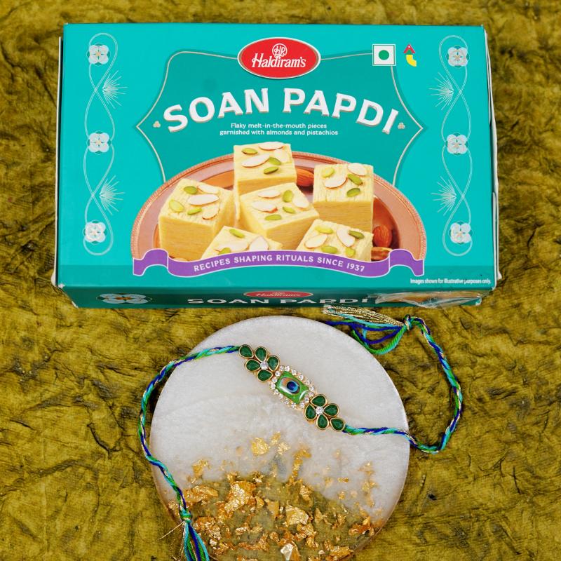 Adorn your brother''s wrist with our Peacock''s Grace Rakhi, a truly unique and artistic piece inspired by the magnificent Morpankh (peacock feather). This beautifully crafted rakhi features an intricate design showcasing the vibrant allure of the peacock''s plume, symbolizing beauty, wisdom, and eternal protection. It''s more than just a thread; it''s a wearable piece of art, reflecting the elegance and spiritual significance of Lord Krishna''s favored adornment. This distinctive token of your affection comes perfectly paired with 250gms of melt-in-your-mouth Soan Papdi, a light and flaky traditional sweet that adds an authentic touch of sweetness to your heartfelt Raksha Bandhan festivities.