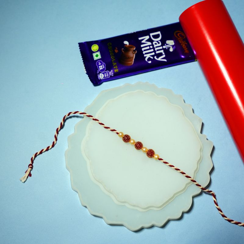 Celebrate Raksha Bandhan with our Pearl Essence Rakhi, adorned with lustrous pearls and accompanied by smooth Dairy Milk chocolates. A perfect blend of elegance and sweetness for your beloved sibling.
