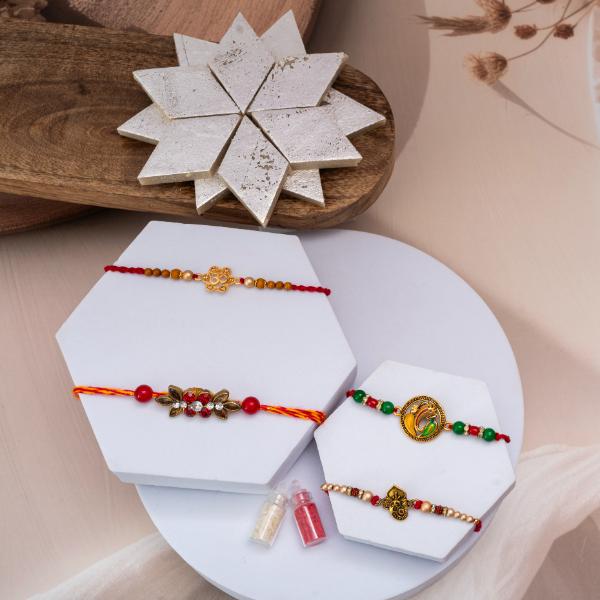 Celebrate Raksha Bandhan with grace and tradition through this elegant set of 4 finely designed rakhis, paired with 200gms of premium Kaju Katli. Each rakhi reflects craftsmanship and care, making it perfect for brothers of all ages. The rich, melt-in-the-mouth cashew sweets add a touch of festive indulgence to this heartfelt gift. Whether you''re tying it in person or sending love across borders, this combo delivers emotion and tradition in one beautiful package.