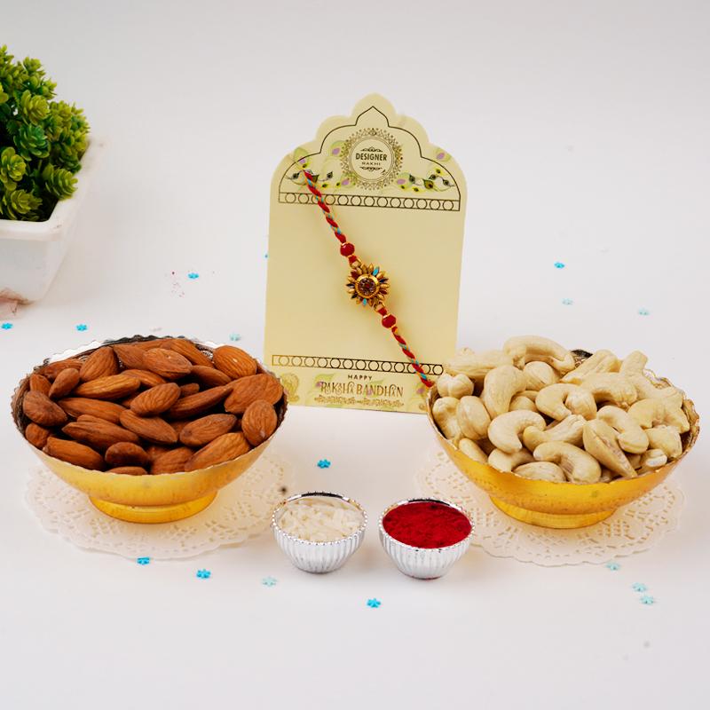 Celebrate the spirit of Raksha Bandhan with divine blessings and wholesome indulgence through this Surya Om Multicolor Stone Rakhi with Almonds 100gm and Cashew 100gm combo. Adorned with vibrant stones and a radiant Om-Surya symbol, this rakhi is tied on a colorful thread that reflects festivity and energy. Paired with premium almonds and cashews, it''s the perfect gift to send rakhi to the USA with both love and nourishment.