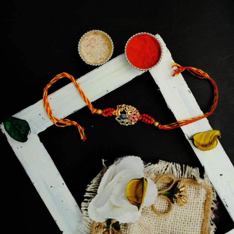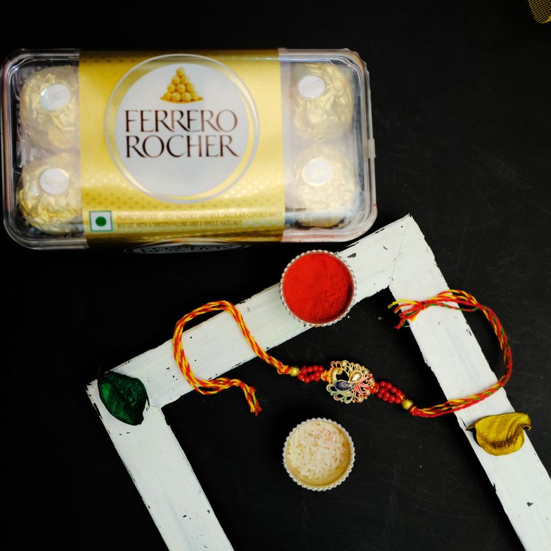 Celebrate Raksha Bandhan with the Radiant Plumage Peacock Rakhi, adorned with vibrant colors and intricate design, accompanied by 12 luxurious Ferrero Rocher chocolates. A perfect blend of tradition and indulgence for your beloved sibling.