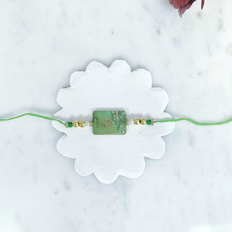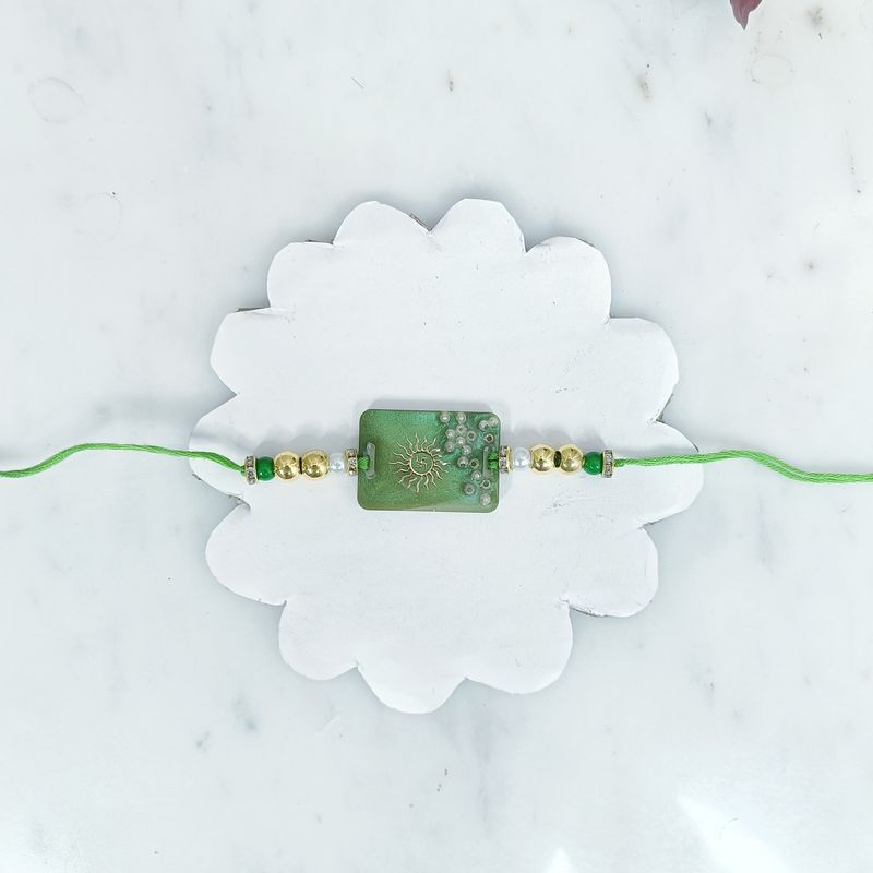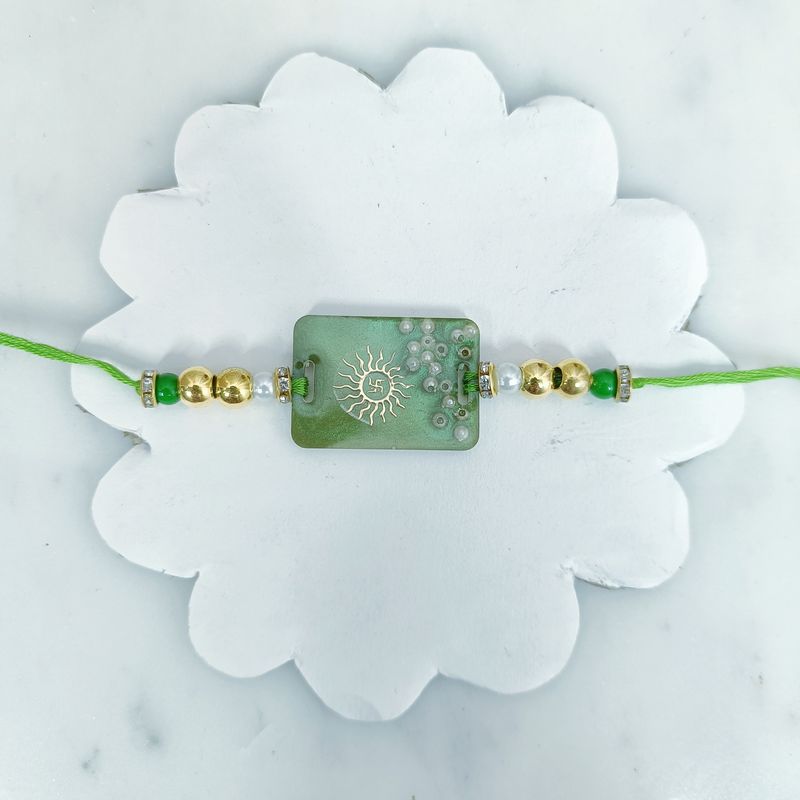 Our Radiant Resin Surya Rakhi combines traditional symbolism with modern craftsmanship. Crafted from high-quality resin, this rakhi features a beautifully detailed Surya (Sun) motif, symbolizing strength and positivity.