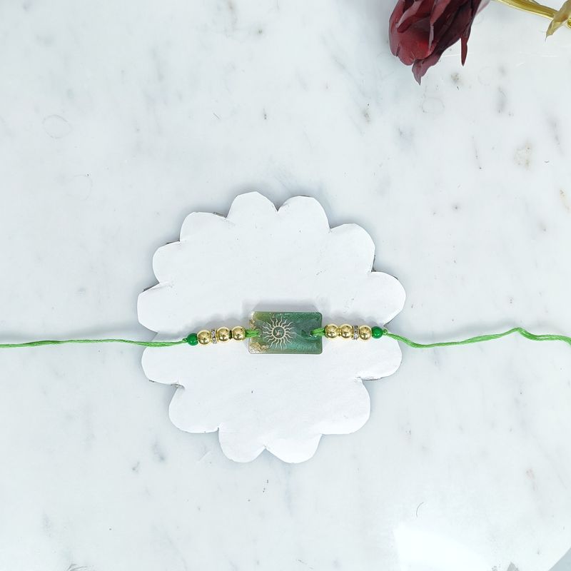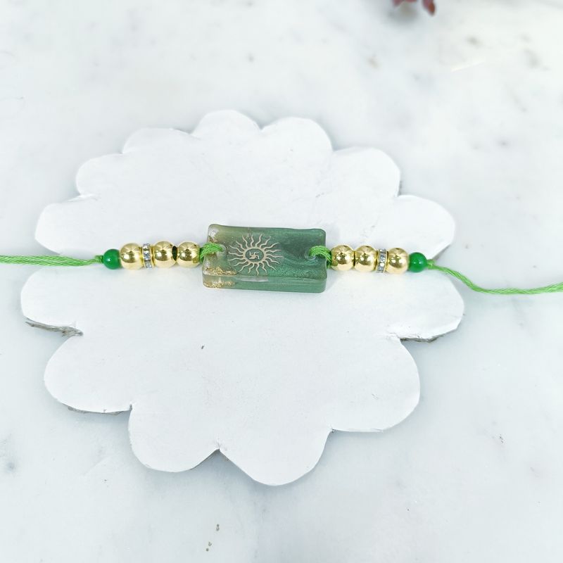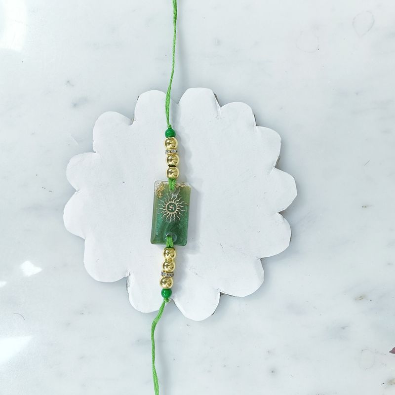 Embrace tradition with a modern twist with our Radiant Resin Surya Rakhi, crafted from premium resin. This exquisite rakhi features a stunning Surya (Sun) design, symbolizing strength and positivity.