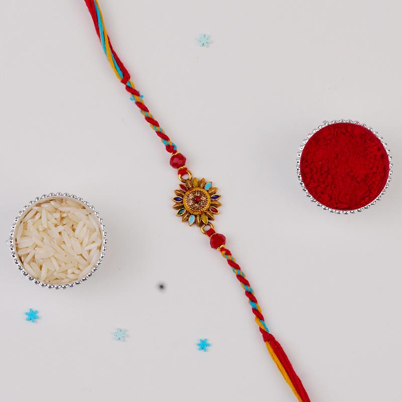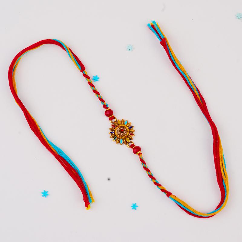 Infuse your Raksha Bandhan with divine energy and festive vibrance with the Radiant Surya Om Multicolor Rakhi. Designed with the sacred Om and radiant Surya motif at its heart, and adorned with vibrant stones on a multicolor thread, this rakhi brings blessings, protection, and celebration together in one stunning piece.