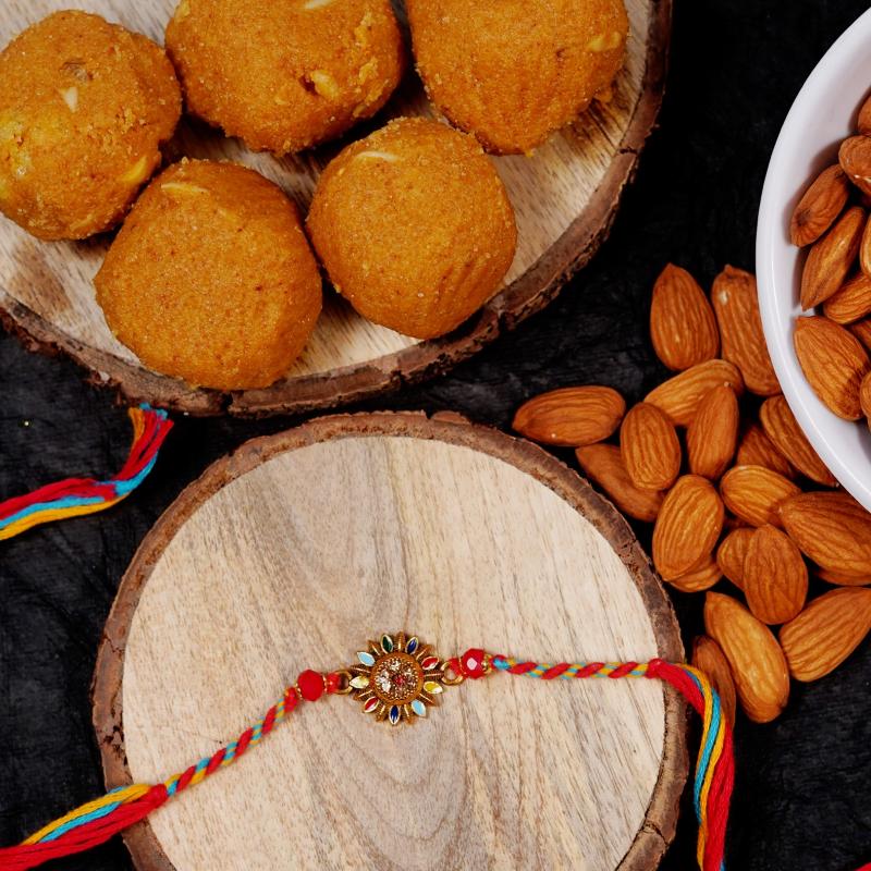 Adorn your brother''s wrist with our Radiant Surya Om Rakhi, a truly unique piece that symbolizes divine energy and spiritual harmony. This exquisite rakhi features a vibrant Surya (Sun) motif beautifully integrated with the sacred ''Om'' symbol, all adorned with a spectrum of multicolor stones and woven onto a multicolor thread. It''s more than just a tie; it''s a powerful blessing for his vitality, peace, and prosperity, reflecting your profound love and good wishes. This auspicious token comes thoughtfully paired with 400gms of rich, melt-in-your-mouth Besan Laddus, a beloved traditional sweet, alongside a wholesome 100gms of premium Almonds, making his Raksha Bandhan truly special and sweet.