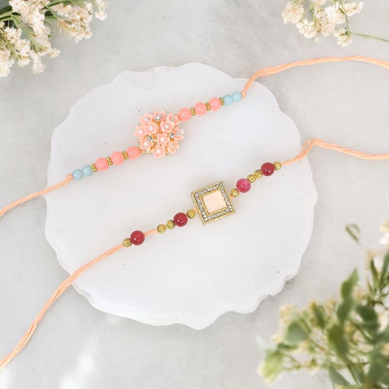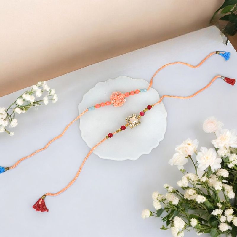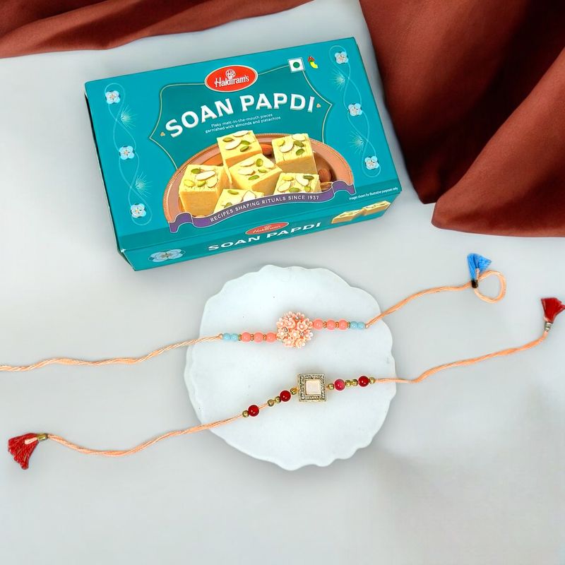 Celebrate the timeless bond of love and siblinghood with our exquisite Set of 2 Designer Rakhis complemented by a delightful box of Soan Papdi. Each rakhi in this stunning duo is meticulously crafted, featuring intricate designs that embody tradition while adding a modern flair. Adorned with vibrant beads and shimmering threads, these rakhis are more than mere adornments—they are tokens of affection that encapsulate the spirit of Raksha Bandhan. The included Soan Papdi, with its flaky texture and rich taste, serves as the perfect treat to share sweet moments together. This festive platter not only enhances the celebrations but also symbolizes the joy of togetherness as you exchange love and promises of protection. Whether you’re miles apart or celebrating side by side, this thoughtful gift set promises to strengthen your bond and create cherished memories that last a lifetime.