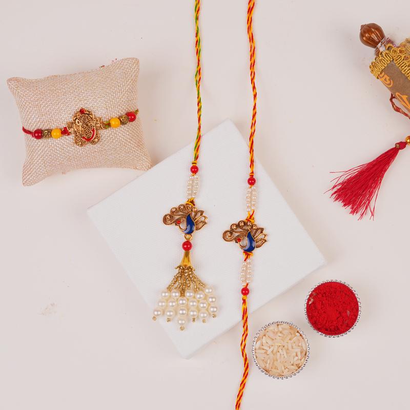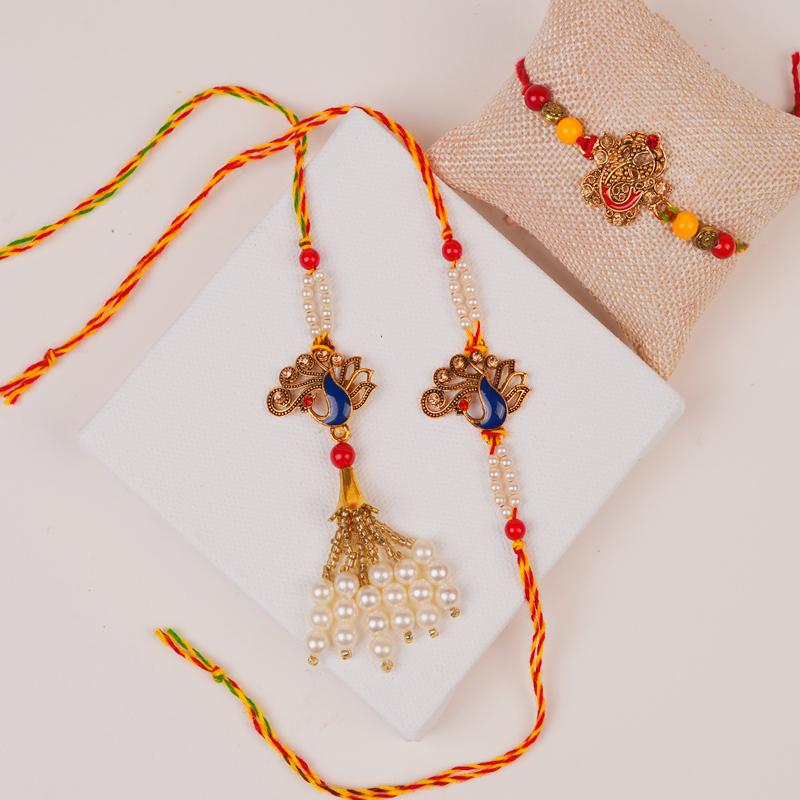 Celebrate the bonds that truly matter with our Regal Feathered Trinity & Sweet Nutty Bliss Rakhi set! This exquisite collection brings together a beautiful peacock-themed Bhaiya Bhabhi Rakhi pair, symbolizing grace, beauty, and eternal love, alongside an auspicious Ganesha Rakhi to invoke blessings for prosperity and wisdom. Each Rakhi is meticulously crafted to be a visual delight. To sweeten this heartfelt gesture, we''ve included a wholesome combo of 100gms premium almonds, packed with goodness, and a generous 400gms of traditional Besan Laddus, offering that melt-in-your-mouth sweetness. It’s a perfect and complete gift that embodies blessings, beauty, and deliciousness for a truly memorable Raksha Bandhan.