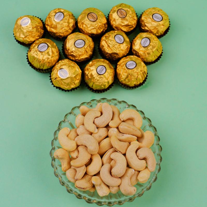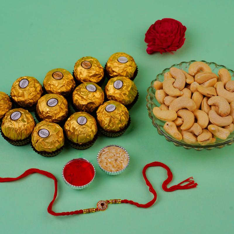 Grace your Raksha Bandhan celebration with this regal Red Thread Kundan Rakhi with 12pcs Ferrero Rocher and 100gm Cashew combo. The rakhi features traditional Kundan work on a bright red thread, exuding elegance and cultural charm. Paired with a box of rich Ferrero Rocher chocolates and crunchy premium cashews, this combo blends tradition, sweetness, and health—perfect for sending rakhi to the USA with warmth and style.