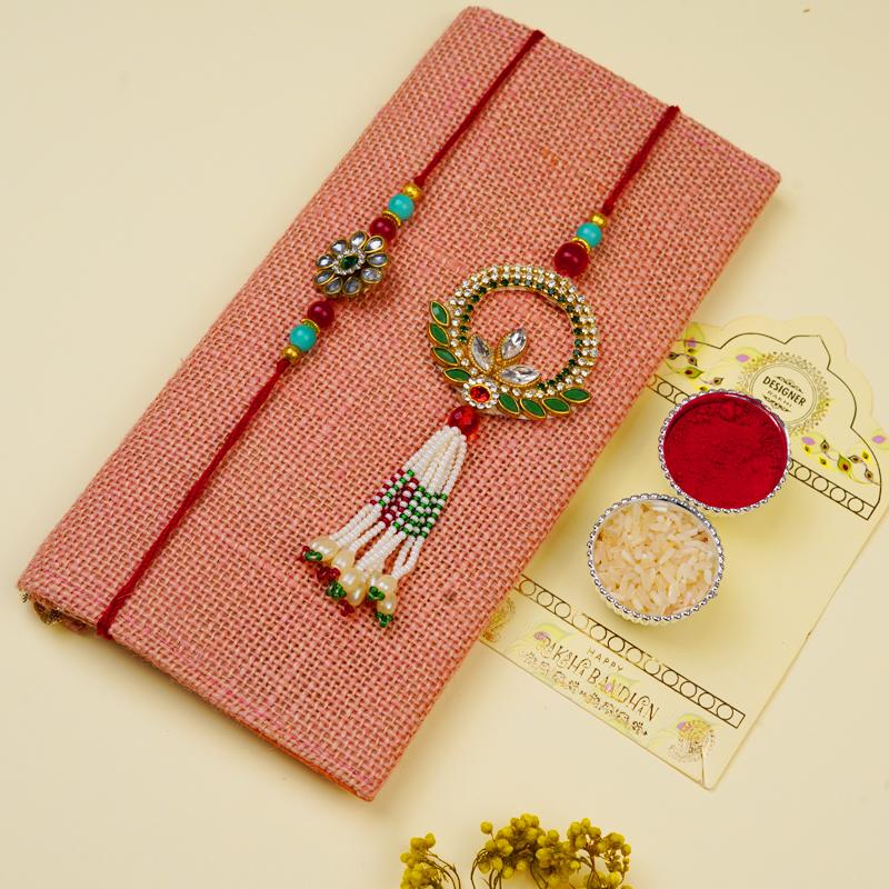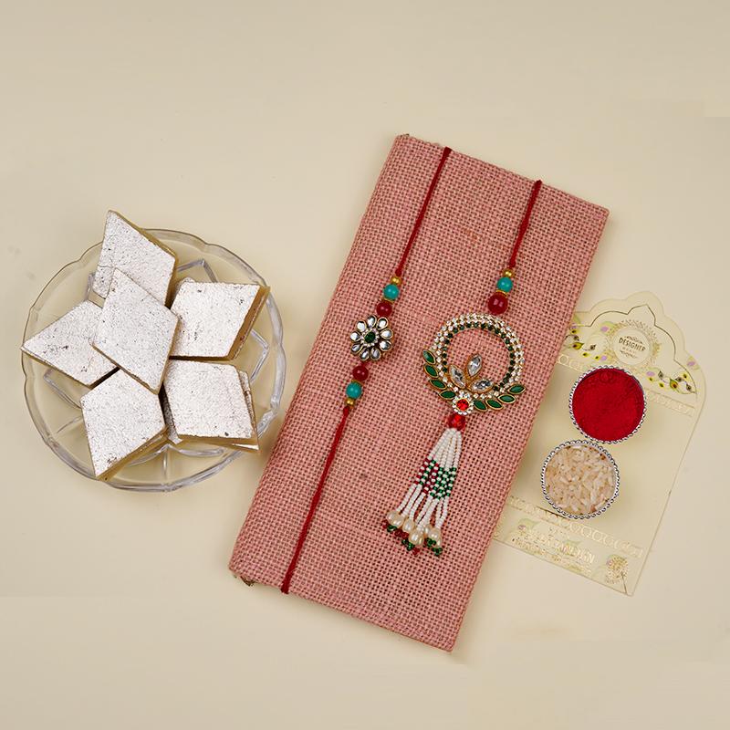 Adorn your beloved Bhaiya and Bhabhi with our Regal Kundan & Kaju Katli Embrace Rakhi set this Raksha Bandhan. This designer pair features exquisite Kundan work, meticulously crafted to radiate traditional charm and opulent elegance. The Bhaiya Rakhi boasts a sophisticated design with intricate detailing, while the accompanying Lumba for Bhabhi dangles gracefully, mirroring the same royal aesthetics. Each Kundan stone reflects the sparkle of your cherished relationship. To sweeten this auspicious occasion, we''ve paired this stunning set with delectable Kaju Katli, adding a rich, melt-in-your-mouth indulgence that perfectly complements the Rakhi''s grandeur. It''s a truly magnificent gift that embodies both timeless beauty and traditional sweetness for a memorable celebration.
