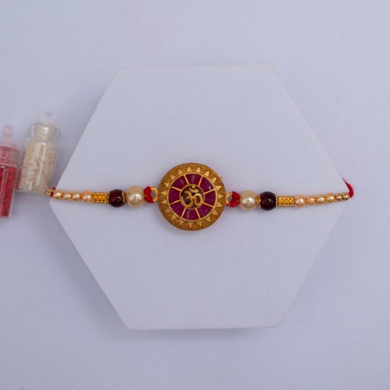Channel the divine spirit of Raksha Bandhan with the Sacred Harmony Red-Golden Om Rakhi. Featuring a radiant Om symbol in golden metal, set against a rich red thread, this rakhi is a perfect blend of tradition, strength, and spiritual energy. A meaningful token for brothers who value cultural depth and classic elegance—this rakhi is both a blessing and a timeless keepsake.