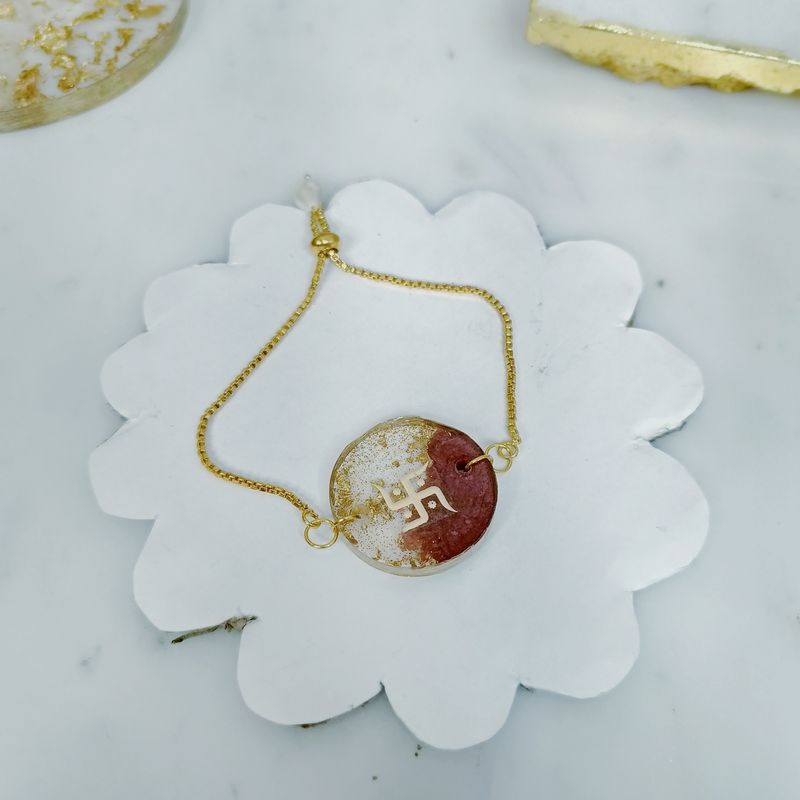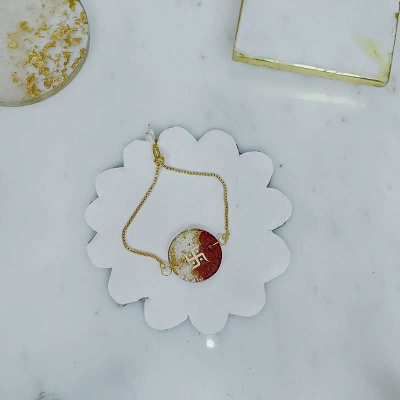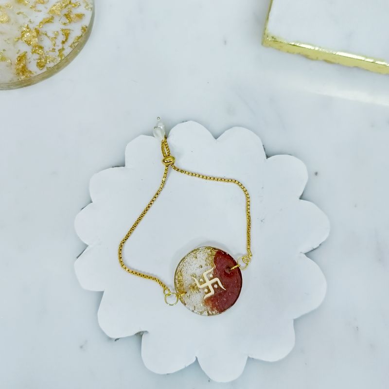 Discover our Resin Swastik Bracelet Rakhi with Divine Charm, blending traditional symbolism with contemporary elegance in resin craftsmanship.