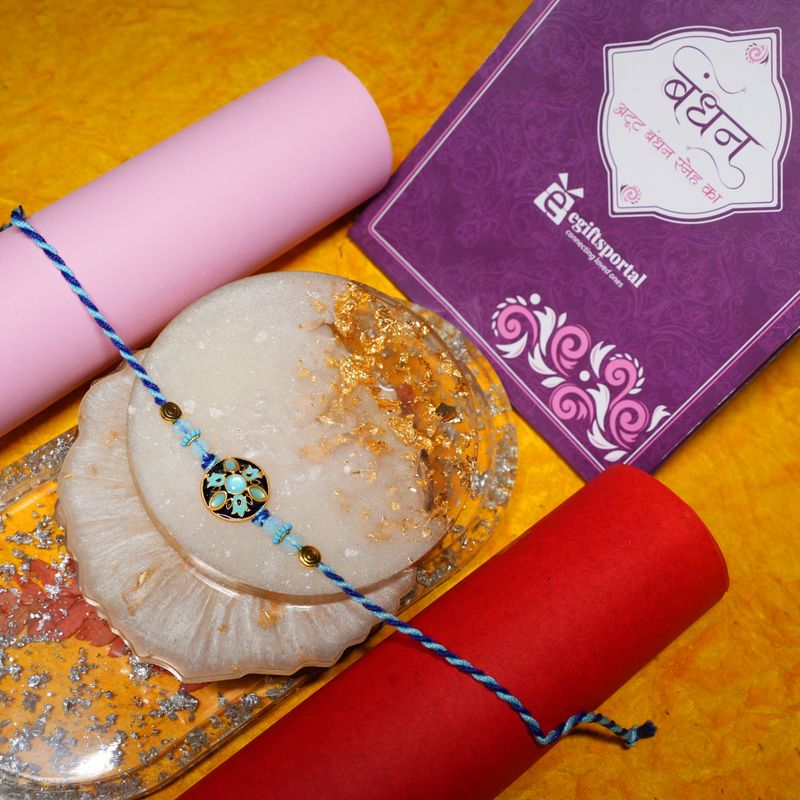 Embrace the spirit of tradition with our Radiant Resplendent Rakhi, a masterpiece of craftsmanship and elegance. This rakhi blends timeless charm with intricate design, making it a perfect token of love and protection for your beloved brother.