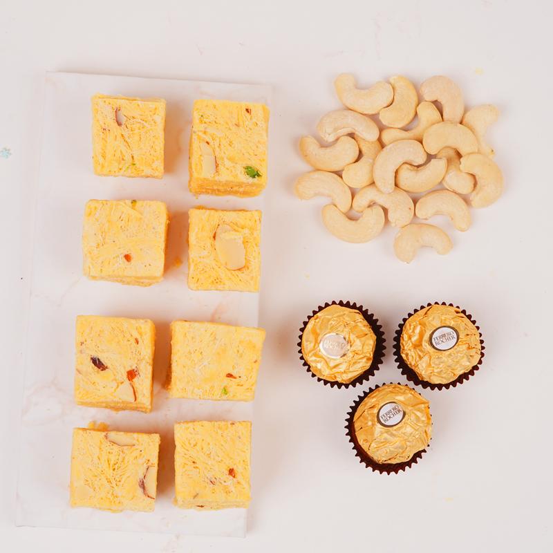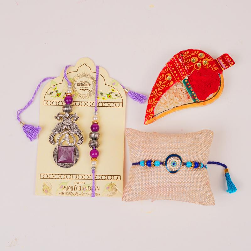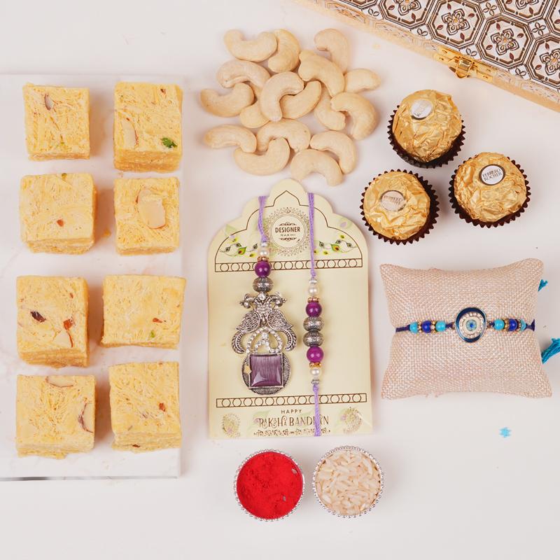 Adorn your cherished Bhaiya and Bhabhi this Raksha Bandhan with our Royal Amethyst & Grand Sweet Medley Rakhi set! This exquisite pair showcases the timeless beauty of deep purple Kundan stones, meticulously set within intricate oxidized metal designs. The regal purple hue symbolizes luxury, wisdom, and eternal affection, perfectly complementing the rustic charm of the oxidized finish. The Bhaiya Rakhi features a robust and elegant design, while the accompanying Lumba for Bhabhi dangles gracefully, echoing the same artisanal craftsmanship. To complete this majestic offering, we''ve included a grand medley of treats: 250gms of delicate Soan Papdi, 100gms of premium cashews, and a luxurious pack of 3 Ferrero Rocher chocolates. It’s a truly magnificent gift, blending traditional artistry with an array of delectable delights for an unforgettable Raksha Bandhan celebration.