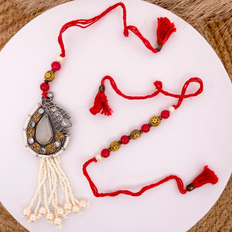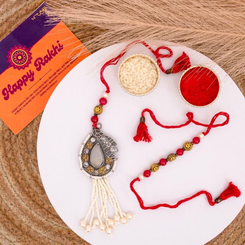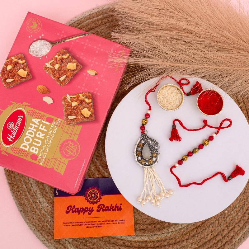 Celebrate the unbreakable bond with our Ruby Glow & Dodha Delight Rakhi Set. This exquisite Bhaiya Bhabhi Rakhi features captivating milky white stones beautifully set on vibrant red threads, symbolizing purity, passion, and enduring love. The Bhaiya Rakhi boasts a sophisticated design, while the accompanying Lumba for Bhabhi elegantly mirrors its charm, creating a harmonious pair. Each stone radiates a subtle glow, making this set a truly unique expression of affection. To sweeten this auspicious occasion, we''ve included 340gms of rich, traditional Dodha Burfi, ensuring a delightful and memorable Raksha Bandhan for your beloved Bhaiya and Bhabhi.