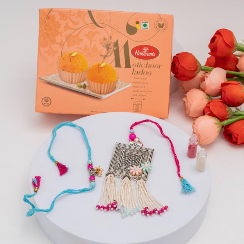 Celebrate the enduring beauty of tradition and the sweetness of your bond with our Rustic Charm & Sweet Indulgence Rakhi Set! This exquisite Bhaiya Bhabhi Rakhi pair features intricately designed oxidized metalwork, exuding a vintage yet elegant appeal that speaks of timeless heritage. The detailed craftsmanship on both the Bhaiya Rakhi and the accompanying Lumba for Bhabhi perfectly captures a sense of antique allure and heartfelt connection. To complete this magnificent offering, we''ve included a generous 340gms of traditional Motichoor Laddus, offering that rich, melt-in-your-mouth sweetness. This set is a perfect blend of artistic tradition and delectable indulgence, promising a truly memorable and joyous Raksha Bandhan for your beloved Bhaiya and Bhabhi.