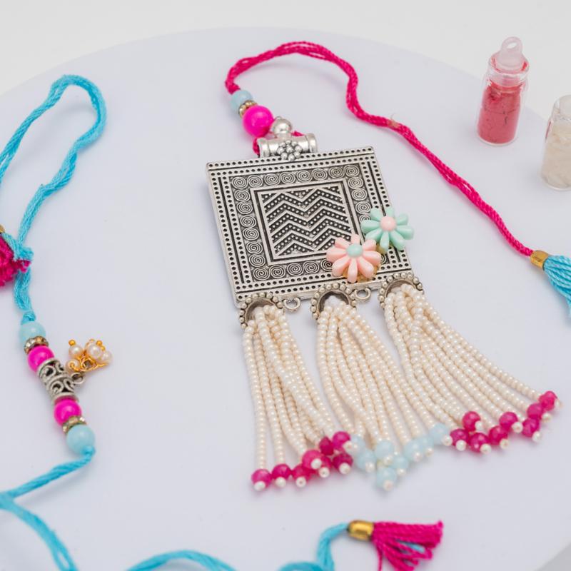 Celebrate the enduring beauty of tradition with our Rustic Charm Oxidized Rakhi Pair. This exquisite Bhaiya Bhabhi Rakhi set features intricately designed oxidized metalwork, exuding a vintage yet elegant appeal that speaks of timeless heritage. The detailed craftsmanship on both the Bhaiya Rakhi and the accompanying Lumba for Bhabhi perfectly captures a sense of antique allure and heartfelt connection. This unique set is a perfect way to honor their special bond with a blend of traditional artistry and a touch of rustic sophistication this Raksha Bandhan.