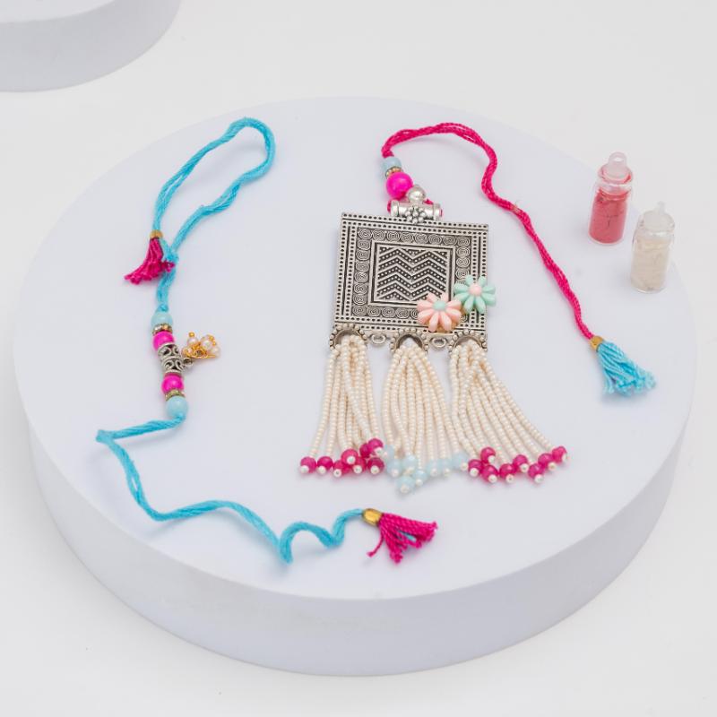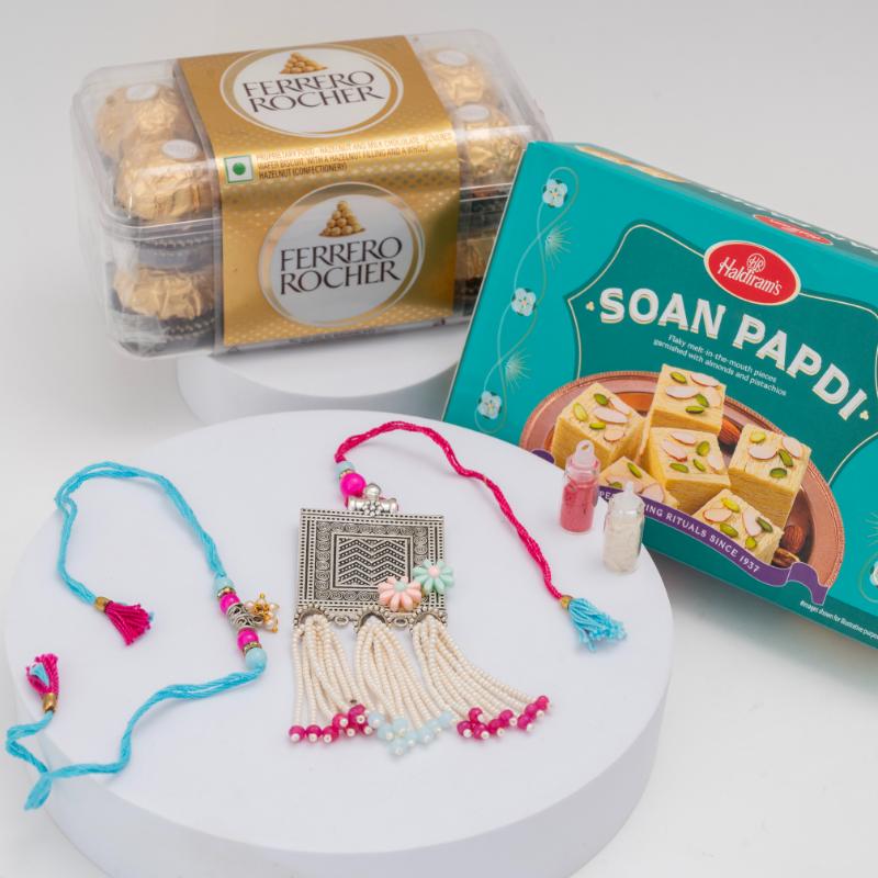 Celebrate the enduring beauty of tradition and the sweetness of your bond with our Rustic Elegance & Grand Sweet Indulgence Rakhi Set! This exquisite Bhaiya Bhabhi Rakhi pair features intricately designed oxidized metalwork, exuding a vintage yet elegant appeal that speaks of timeless heritage. The detailed craftsmanship on both the Bhaiya Rakhi and the accompanying Lumba for Bhabhi perfectly captures a sense of antique allure and heartfelt connection.