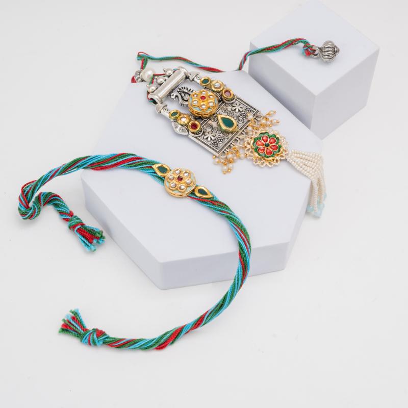 Adorn your Bhaiya and Bhabhi this Raksha Bandhan with our Rustic Radiance & Chic Utility Rakhi Set. This exquisite pair features intricately designed oxidized metalwork adorned with a vibrant array of multicolor stones, blending traditional charm with a touch of contemporary artistry. The unique combination of rustic metal and colorful embellishments creates a truly eye-catching tribute to their bond. The Bhaiya Rakhi boasts a distinctive design, while the matching Lumba for Bhabhi dangles gracefully, reflecting the same captivating allure. Adding a thoughtful and practical touch, this set comes with a stylish makeup pouch. It''s perfect for your Bhabhi to store her essentials, keeping her organized and chic. This Rakhi set is a beautiful blend of traditional artistry and modern utility, making their Raksha Bandhan truly special.