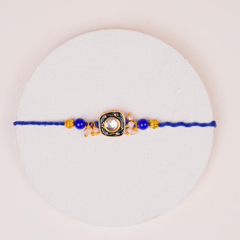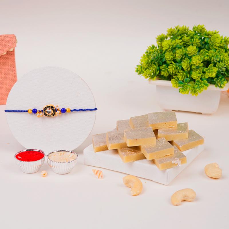 Adorn your brother''s wrist with our Sapphire Serenity Designer Rakhi, a unique piece that exudes contemporary elegance and profound meaning. This exquisite rakhi features a captivating blue stone at its heart, set within an artfully crafted design. The serene blue hue symbolizes tranquility, trust, and unwavering loyalty—much like the cherished bond you share. More than just a thread, it''s a statement of style and affection, meticulously designed to be a memorable token. This distinctive rakhi comes perfectly paired with 200gms of rich, melt-in-your-mouth Kaju Katli, adding a touch of classic sweetness to your heartfelt Raksha Bandhan celebrations.