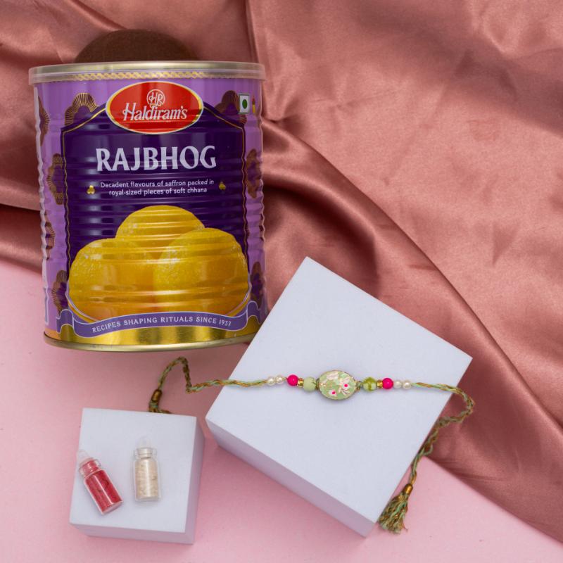 Adorn your brother''s wrist with our Serene Pistachio Stone Rakhi, a truly unique piece that blends subtle elegance with heartfelt blessings. This distinctive rakhi features a polished, pista-colored stone at its heart, radiating calm, renewal, and prosperity—much like the serene hue of its namesake. It''s more than just a thread; it''s a unique token of your affection, symbolizing growth and tranquility for your beloved brother. This beautiful rakhi comes paired with a generous 1kg of rich, saffron-infused Raj Bhog, those delightful, spongy cheese dumplings that promise a regal sweetness to his Raksha Bandhan celebrations.