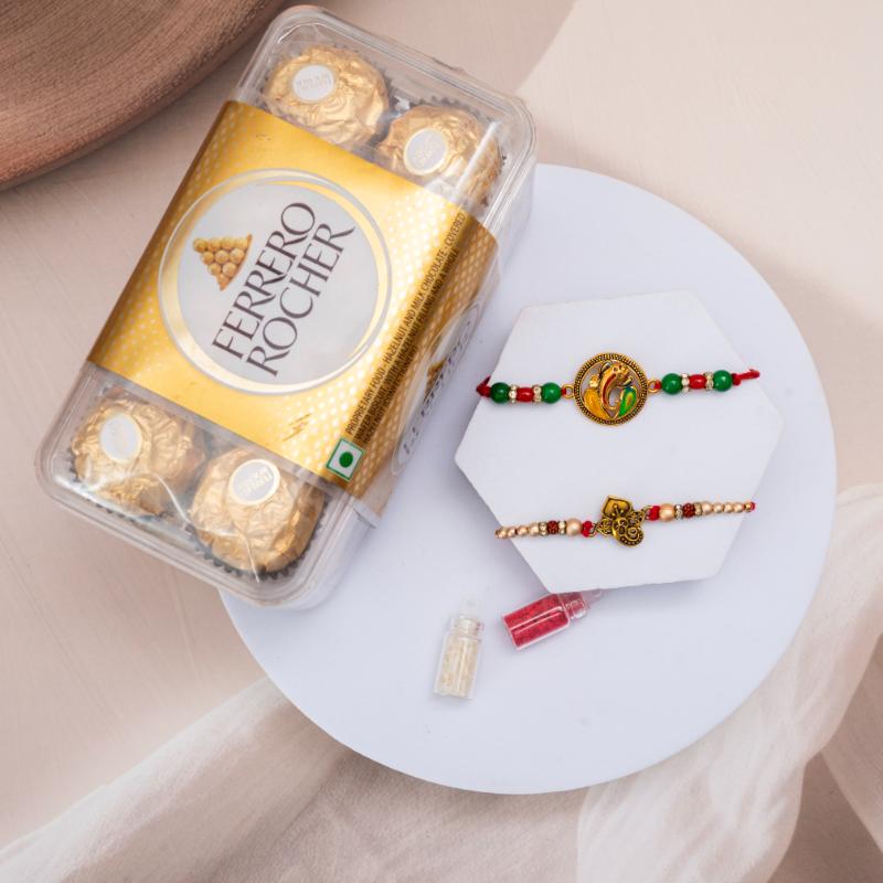 Celebrate Raksha Bandhan with devotion and indulgence. This set includes two beautifully designed Ganesha rakhis—symbols of protection, wisdom, and blessings—paired with a box of 12 Ferrero Rocher chocolates. A perfect blend of spirituality and sweetness, this combo is ideal for making your brother feel cherished and blessed, no matter where he is.