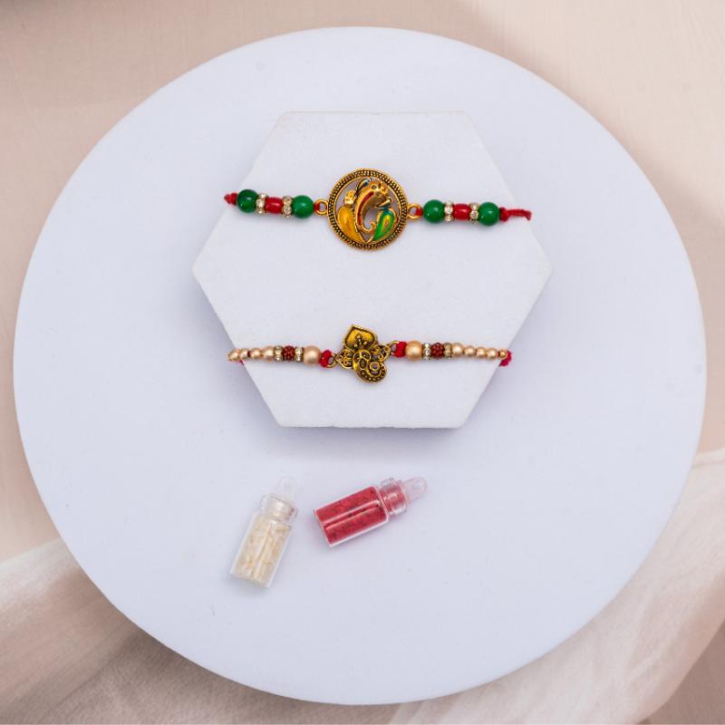 Celebrate the sacred bond of Raksha Bandhan with this divine combo featuring two beautifully crafted Ganesha rakhis and 1kg of soft, syrupy gulab jamun. Symbolizing blessings, protection, and prosperity, the rakhis pair perfectly with the sweetness of this timeless Indian dessert—making it a heartwarming gift for your brother that blends tradition, love, and indulgence.