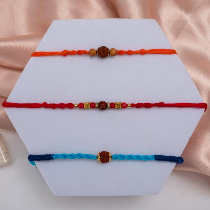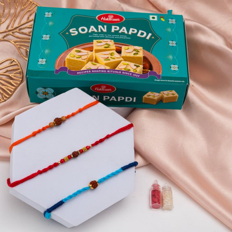 Celebrate Raksha Bandhan with divine blessings and classic Indian sweetness. This Set of 3 Rudraksha Rakhis with Soan Papdi 250gms features three beautifully handcrafted rakhis adorned with sacred rudraksha beads, symbolizing peace, strength, and spiritual protection. Paired with 250gms of flaky, melt-in-the-mouth soan papdi, this combo is a perfect expression of tradition and affection for your beloved brothers.
