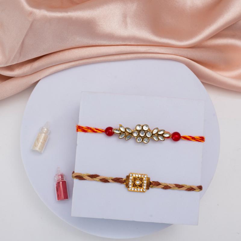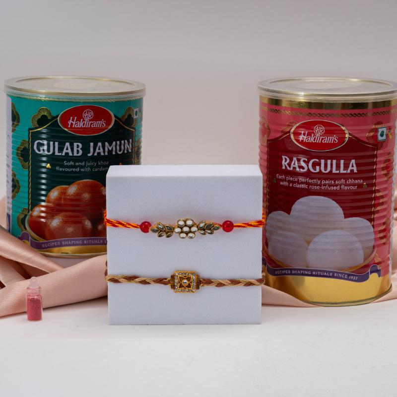 Celebrate Raksha Bandhan in grand style with this Stone & American Diamond Rakhi Set paired with 1kg each of rasgulla and gulab jamun. One rakhi features a bold stone centerpiece, while the other sparkles with American diamond elegance. Combined with two classic Indian sweets, this festive combo is a perfect mix of tradition, style, and indulgence for your beloved brother.