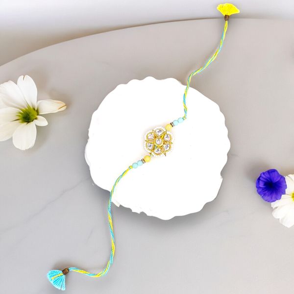 The stunning yellow meenakari rakhi is a vibrant embodiment of tradition and artistry, destined to sprinkle a dash of joy and color into the sacred bond of sibling love. Handcrafted with meticulous precision, this rakhi features intricate meenakari work that showcases exquisite floral patterns in rich hues, radiating warmth and affection. The brilliant yellow base symbolizes happiness, prosperity, and positivity, making it a perfect emblem for the cherished festival of Raksha Bandhan. Adorned with delicate embellishments and shimmering accents, it beautifully captures the essence of Indian craftsmanship. This rakhi is not just a thread; it’s a heartfelt token of love, designed to honor the unique bond between brothers and sisters. When tied around the wrist, it serves as a protective charm and a reminder of the eternal connection shared, creating moments of joy and cherished memories that last a lifetime, making it an exceptional choice for celebrating this special occasion.
