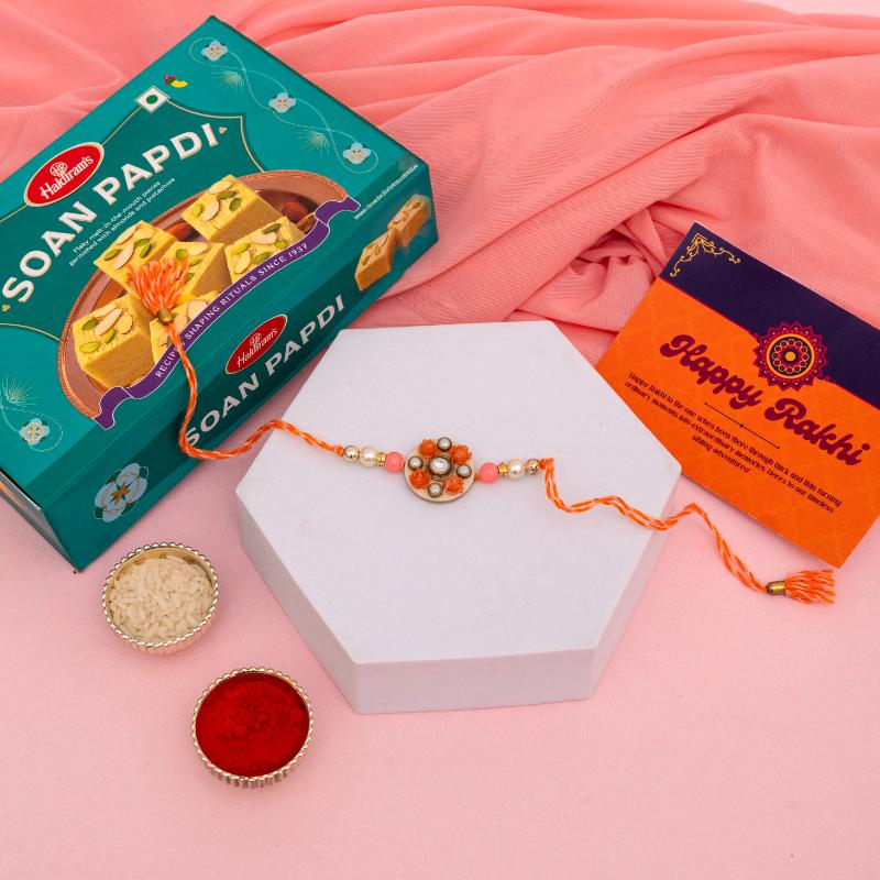 Adorn your brother''s wrist with our Sunset Bloom Rakhi, a truly unique piece that captures the warmth and vibrancy of a setting sun. This delightful rakhi features a charming floral design, beautifully accentuated with luminous orange beads and a cheerful orange thread. It''s more than just a thread; it''s a symbol of joy, energy, and the blossoming bond you share, reflecting happiness and positive vibes. This distinctive token of your affection comes perfectly paired with 250gms of melt-in-your-mouth Soan Papdi, a light and flaky traditional sweet that adds an authentic touch of sweetness to your heartfelt Raksha Bandhan festivities.