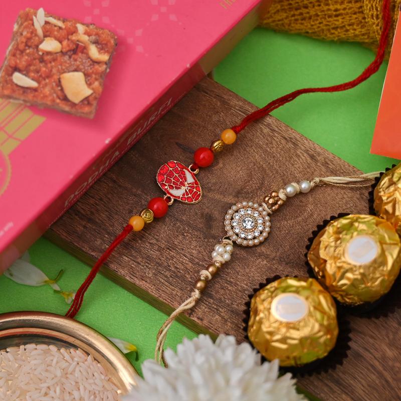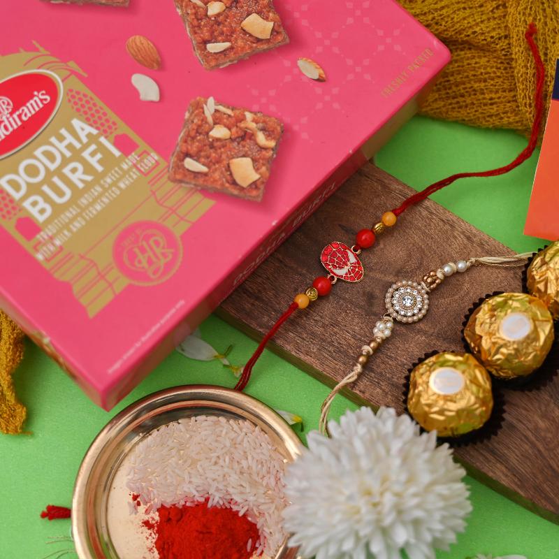 Celebrate Raksha Bandhan with a delightful blend of classic elegance and playful excitement for your beloved brothers! This unique combo includes: Ethnic Beige Rakhi: Adorn your brother''s wrist with this beautifully crafted ethnic beige rakhi. Its subtle elegance and intricate design reflect timeless tradition and the enduring purity of your bond, making it a sophisticated token of your affection. Spiderman Kids Rakhi: Delight your younger sibling with an action-packed Spiderman Kids Rakhi, featuring everyone''s favorite web-slinging superhero! This fun and vibrant rakhi is perfect for adding a touch of adventure and excitement to his wrist. This delightful Raksha Bandhan set comes perfectly paired with 340gms of rich, traditional Dodha Burfi, a dense and fudgy sweet known for its distinctive caramelized flavor, and three exquisite Ferrero Rocher chocolates, adding a touch of gourmet indulgence. It''s the perfect way to make their celebration truly sweet and memorable!