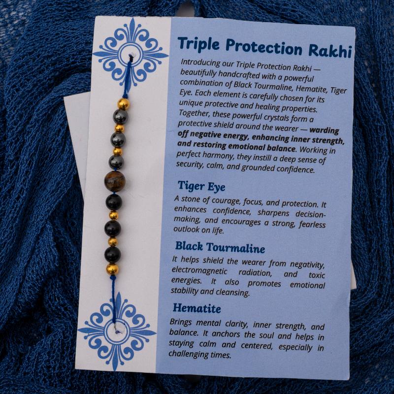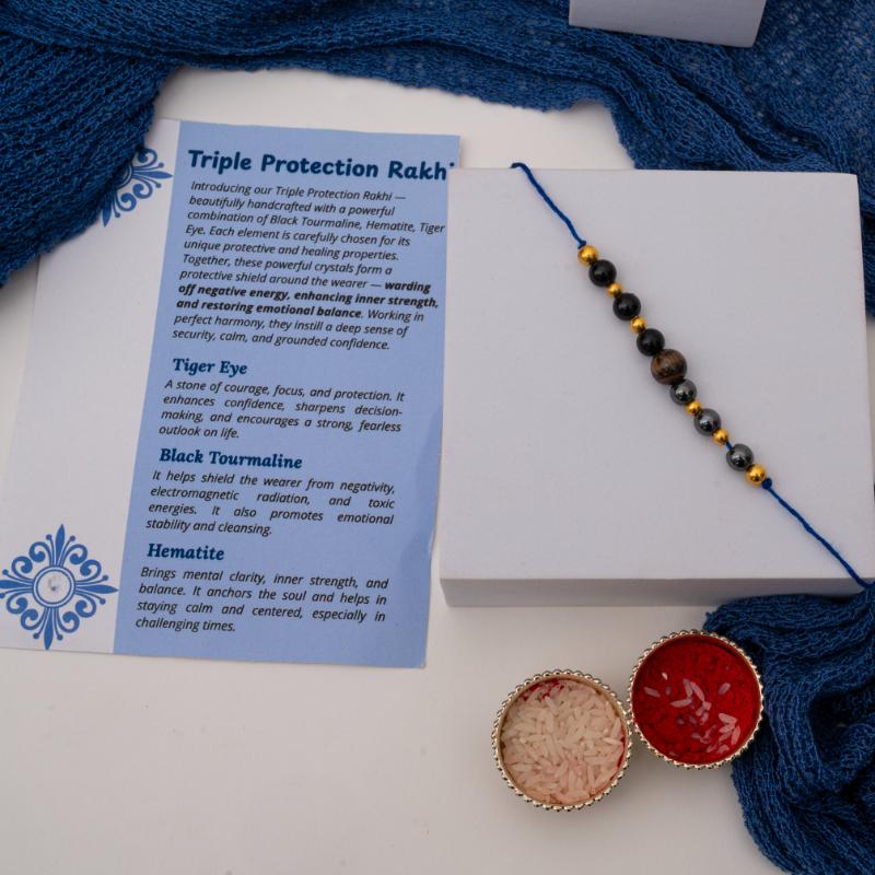 Wrap your brother’s wrist with the strength of intention and energy through our Triple Shield Energy Protection Rakhi. Crafted with a powerful trio of black obsidian, tiger eye, and hematite stones, this rakhi is designed to offer emotional grounding, spiritual clarity, and energetic protection. Elegant and symbolic, it’s perfect for the brother who stands tall through every storm. Gift him a rakhi that reflects your wish for his strength, safety, and peace.