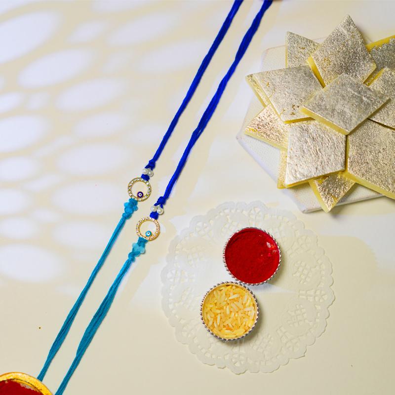 Ward off negativity and double the blessings for your brothers with our unique Twin Azure Eye Protection Rakhi Set. This distinctive duo features two potent Evil Eye charms, each elegantly set amidst vibrant blue threads and shimmering blue beads, symbolizing vigilance, peace, and good fortune. More than just threads, these are powerful talismans designed to safeguard your brothers from ill-will and bring them tranquility, reflecting your deep care and unwavering support. This meaningful set comes perfectly paired with 200gms of rich, melt-in-your-mouth Kaju Katli, adding a delightful touch of traditional sweetness to their Raksha Bandhan celebration.