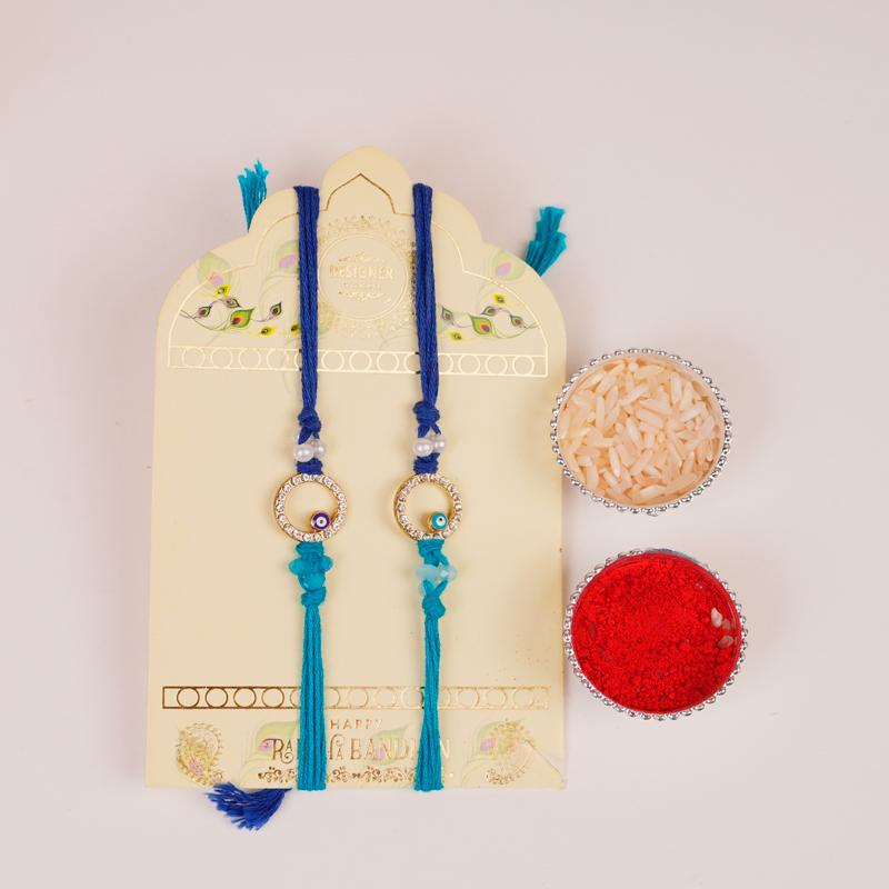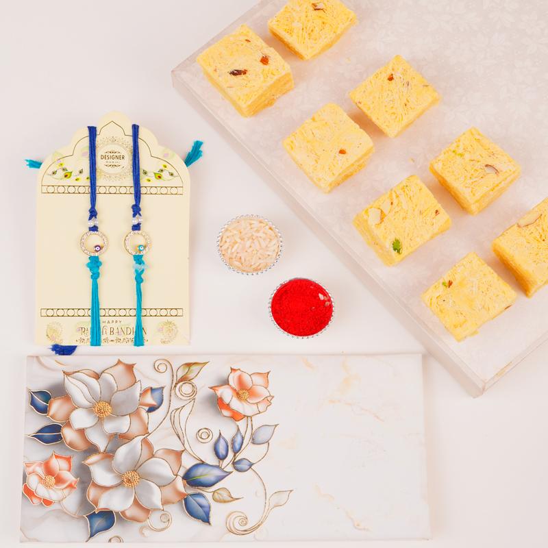 Ward off negativity and double the blessings for your brothers with our unique Twin Azure Eye Protection Rakhi Set. This distinctive duo features two powerful Evil Eye charms, each elegantly set amidst vibrant blue threads and shimmering blue beads, symbolizing vigilance, peace, and good fortune. More than just threads, these are potent talismans designed to safeguard your brothers from ill-will and bring them tranquility, reflecting your deep care and unwavering support. This meaningful set comes perfectly paired with 250gms of melt-in-your-mouth Soan Papdi, adding a delightful touch of traditional sweetness to their Raksha Bandhan celebration.