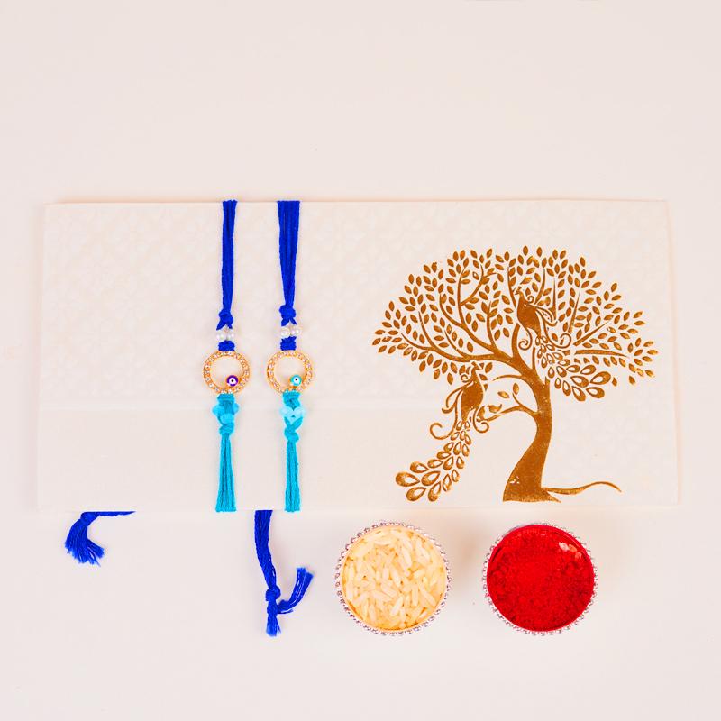 Shield your siblings with blessings and nourish them with love through this Evil Eye Rakhi Set of 2 with Cashews & Almonds. Featuring two stylish evil eye rakhis known to ward off negativity, this combo adds both meaning and charm to your Raksha Bandhan. Paired with crunchy almonds and premium cashews, it''s the perfect thoughtful gift—ideal for celebrating together or sending rakhi to the USA.