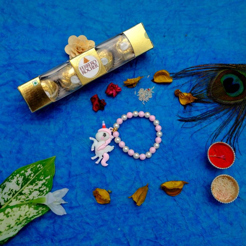 Add a dash of magic and sweetness to Raksha Bandhan with our Unicorn Rakhi Bracelet with Ferrero Rocher. Designed in dreamy pastels and sparkles, this unicorn-themed rakhi bracelet is perfect for your little sister. Paired with 3 golden Ferrero Rocher chocolates, it’s a charming blend of fantasy and flavor—an ideal surprise whether you’re celebrating together or sending love across to the USA.