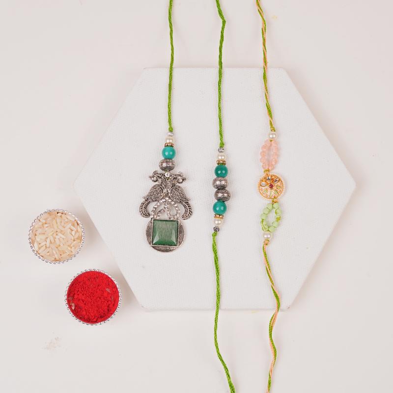 Adorn your cherished Bhaiya and Bhabhi with our Verdant Elegance & Double Sweet Indulgence Rakhi set this Raksha Bandhan! This exquisite collection features a green Kundan oxidised metal Bhaiya Bhabhi Rakhi set, showcasing the timeless beauty of deep green Kundan stones meticulously set within intricate oxidised metal designs. The rich green hue symbolizes growth, prosperity, and harmony, perfectly complementing the rustic charm of the oxidised finish. The Bhaiya Rakhi boasts a robust and elegant design, while the accompanying Lumba for Bhabhi dangles gracefully, echoing the same artisanal craftsmanship. Adding to this special offering, a designer Brother Rakhi is also included, providing an extra touch of unique style for your sibling. To sweeten their celebration beyond measure, we’ve included a generous 1kg of melt-in-your-mouth Gulab Jamun and another 1kg of delectable Rasogolla, ensuring an abundance of traditional Indian sweetness. It’s a magnificent gift that combines traditional artistry with a grand feast of delightful treats, ensuring an unforgettable and truly sweet occasion for the entire family.