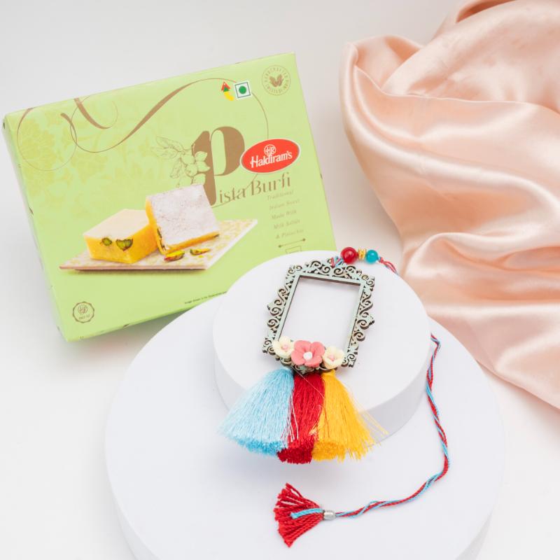 Adorn your Bhabhi''s wrist with our Vibrant Bloom & Pistachio Delight Lumba Rakhi, a celebration of color and sweet indulgence! This exquisite Lumba features a stunning array of colorful floral designs, meticulously crafted to create a miniature garden on her wrist. Each petal and leaf bursts with vivid hues, symbolizing joy, prosperity, and the blossoming love within your family. The delicate craftsmanship and vibrant palette make this Lumba a true statement piece, reflecting the lively spirit and grace of your Bhabhi. To sweeten this thoughtful gesture, we''ve included a generous 340gms of rich, traditional Pista Burfi, known for its delightful pistachio flavor and melt-in-your-mouth texture. It''s a perfect blend of tradition, artistic beauty, and delectable indulgence, ensuring she feels truly cherished this Raksha Bandhan.